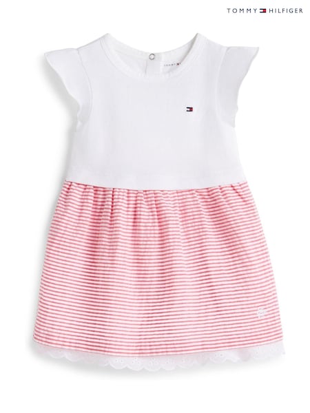 Tommy Hilfiger White Stripe Seersucker Broderie Short Sleeve Dress