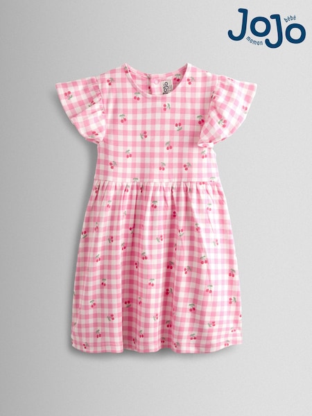 JoJo Maman Bébé Pink Gingham Cherry Printed Flutter Sleeve Dress