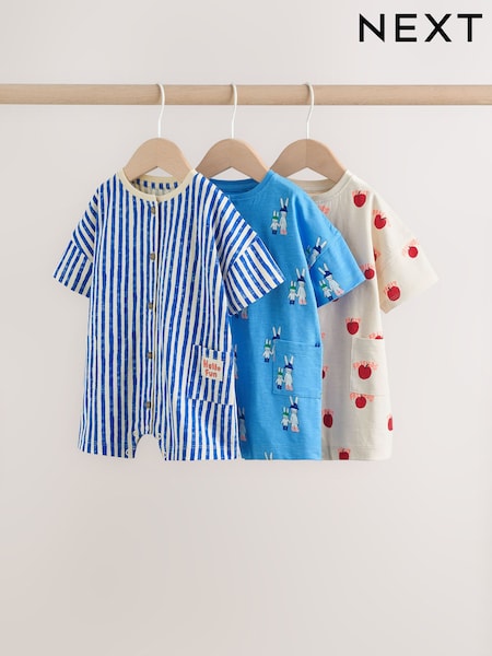 Blue/Ecru Printed Jersey Baby Rompers 3 Pack