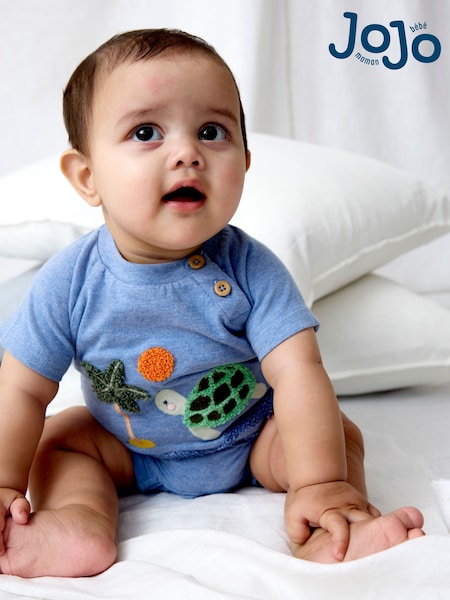 JoJo Maman Bébé Blue Turtle Appliqué Romper & Hat Set