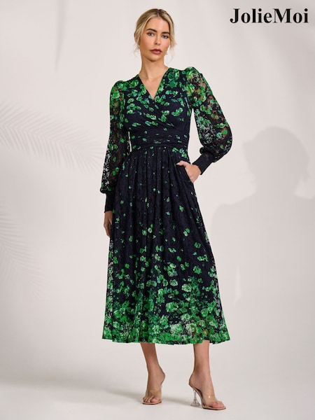 Jolie Moi Green Long Sleeve Printed Lace Maxi Dress
