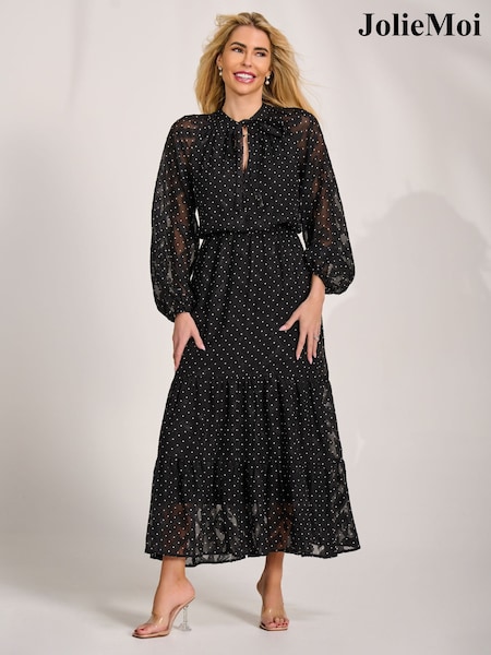 Jolie Moi Black Textured Chiffon Long Sleeve Maxi Dress