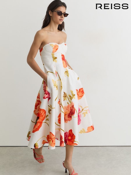 Reiss Cream/Red Penelope Cotton Floral Bustier Midi Dress with Stretch