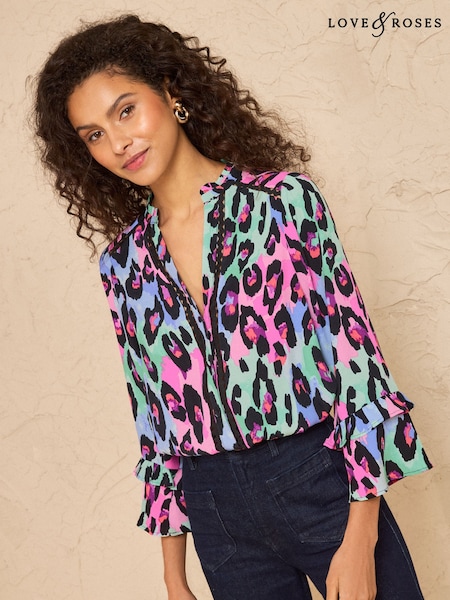 Love & Roses Animal Print Notch Neck 3/4 Flute Sleeve Button Through Blouse