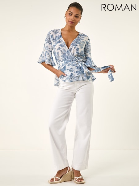 Roman Blue Floral Frill Wrap Top