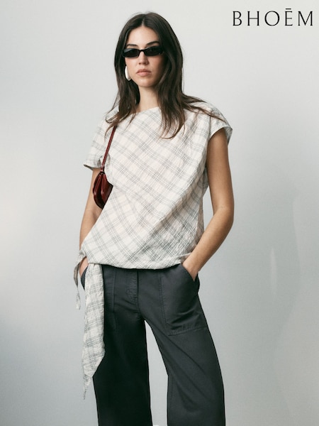 BHOEM Ecru/Grey Check Short Sleeve Blouse with Tie Detail Hem