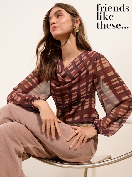 Friends Like These Burgundy Red Check Print Long Sleeve Sheer Chiffon Cowl Neck Blouse