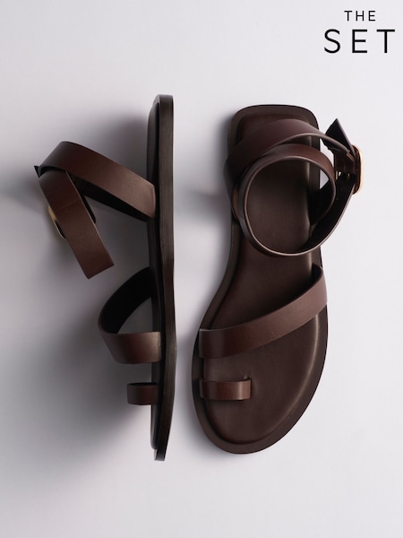 The Set Premium Leather Toe Loop Sandals Chocolate Brown