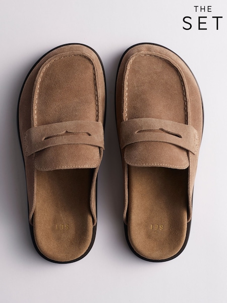 The Set Premium Comfort Suede Backless Footbed Loafers Chocolate Brown