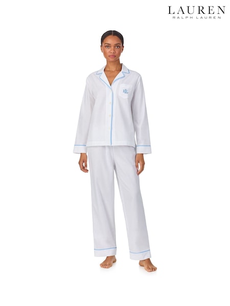 Lauren Ralph Lauren White Cotton Herringbone Long Sleeve Notch Collar Pajama Set