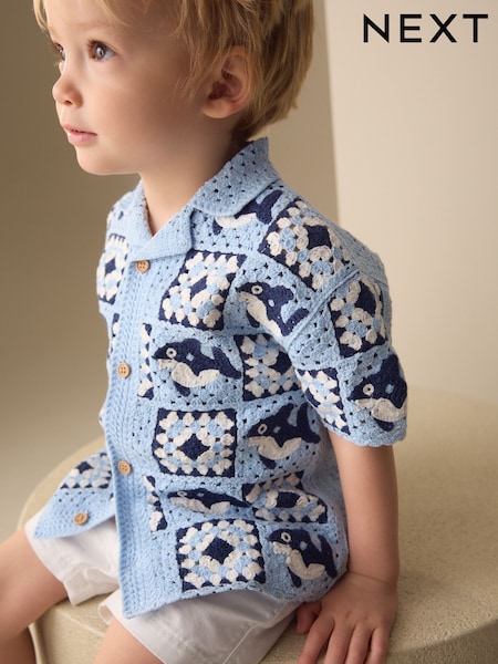 Rechin albastru - Crochet Knitted Short Sleeve Shirt (12mths-10yrs)