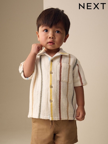 Ecru Striped - Cămașă texturată cu mânecă scurtă și guler cu rever (3luni-7ani)