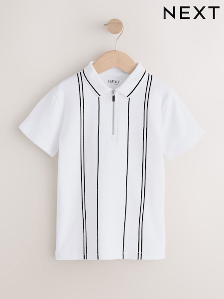 Alb/Negru - Tricou polo cu dungi verticale și fermoar la gât (3-16ani)