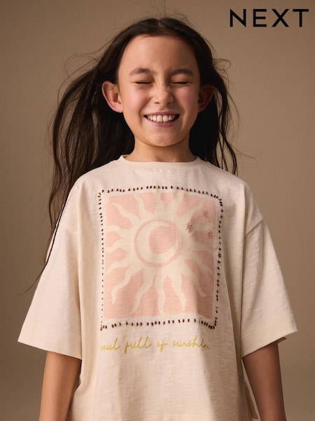 Ecru soare - Beaded Oversized Boxy T-Shirt (3-16yrs)