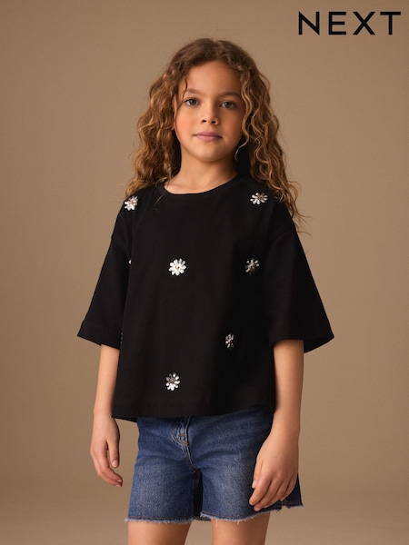 Negru Floare - Oversized Boxy Sequin T-Shirt (3-16yrs)