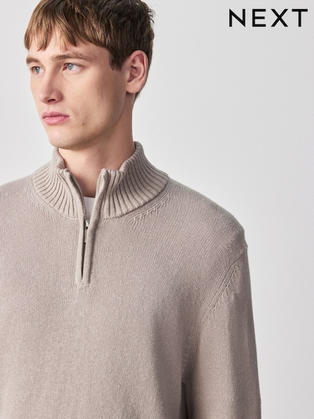 Neutral - Regular Fit Linen Rich Quarter Zip Neck Jumper