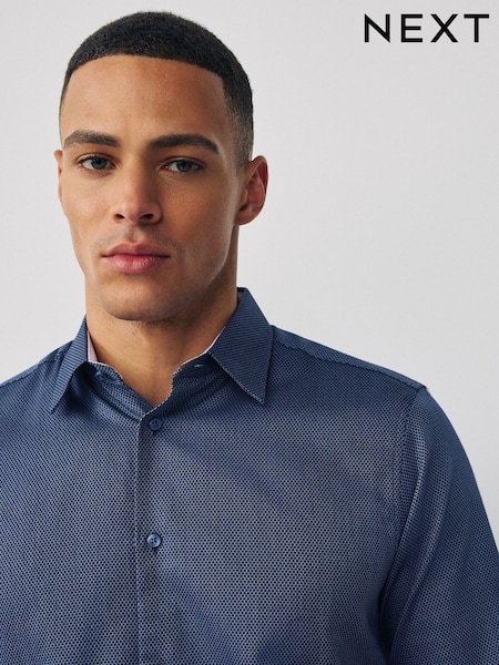 Albastru safir - Măsură regular - Cotton Textured Slim Fit Long Sleeve Formal Shirt With Trim