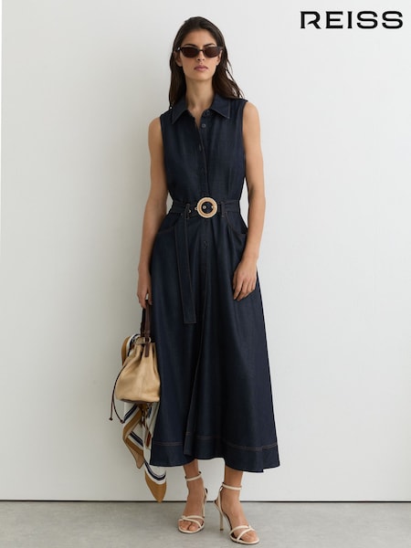 Reiss Rosie Denim Sleeveless Waisted Midi Dress