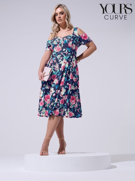 Albastru - Yours Curve London Floral Cold Shoulder Panel Skater Dress