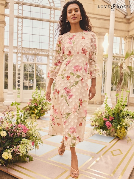 Love & Roses 3D Crew Embellished Neck Midi Dress