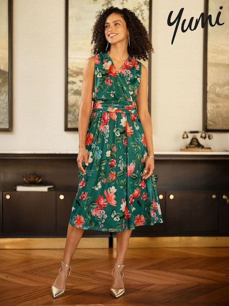 Verde - Yumi Blurred Floral Print Mesh Stretch Midi Dress With Pockets