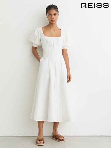 Reiss Riva Linen Puff-Sleeve Embroidered Midi Dress