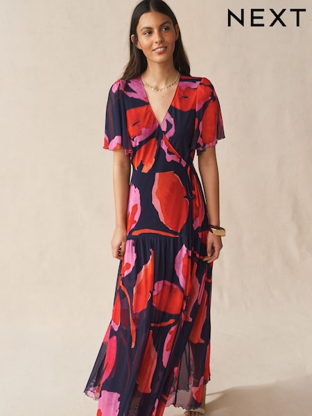 Red and Navy Flower Print - Short Sleeve Wrap Midi Occasion Dress