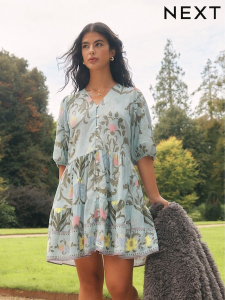 Albastru - National Trust x Next Short Sleeve Button Through Tiered Mini Dress