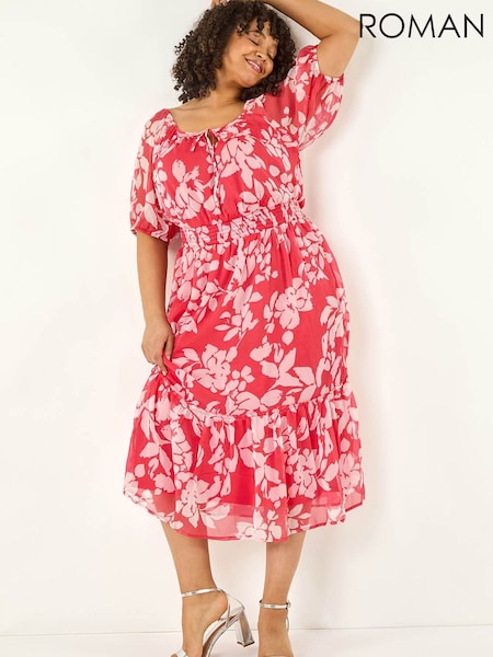 Rochie midi cu fundă la gât și imprimeu tropical Roman Curve
