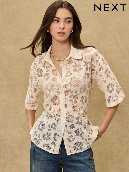 Ecru - Lace Short Sleeve Tie Back Shirt